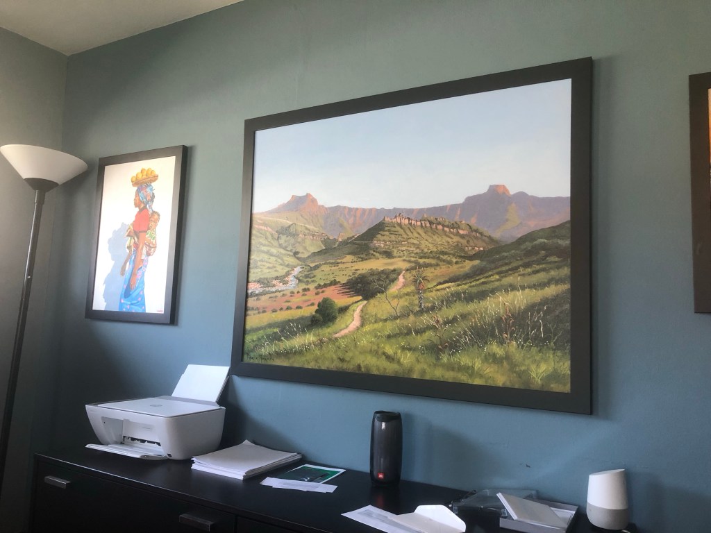 I love our large painting of the Berg’s Amphitheater by Peter VanHeereden which hangs in my counseling study. The living room has several Western Cape scenes and one large up close protea. A conversation starter and much loved piece is a painting of a woman with a sleeping baby tied to her back and a basket of fruit balance on her head. Each of these is by Western Cape artist Willem Onker. There are two breaking wave scenes by Pretoria’s Trevor Beach – who only paints waves!